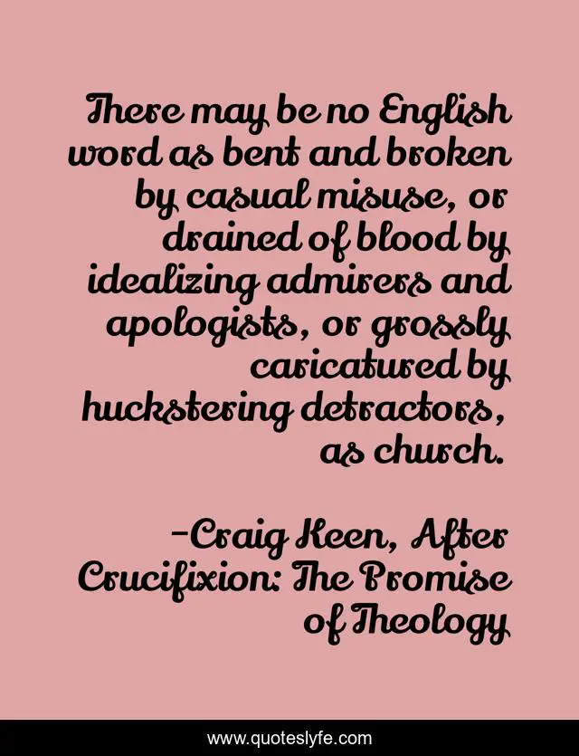 This page presents the quote "There may be no English word as bent and broken by casual misuse, or drained of blood by idealizing admirers and apologists, or grossly caricatured by huckstering detractors, as church.". Author of this quote is Craig Keen, After Crucifixion: The Promise of Theology. .