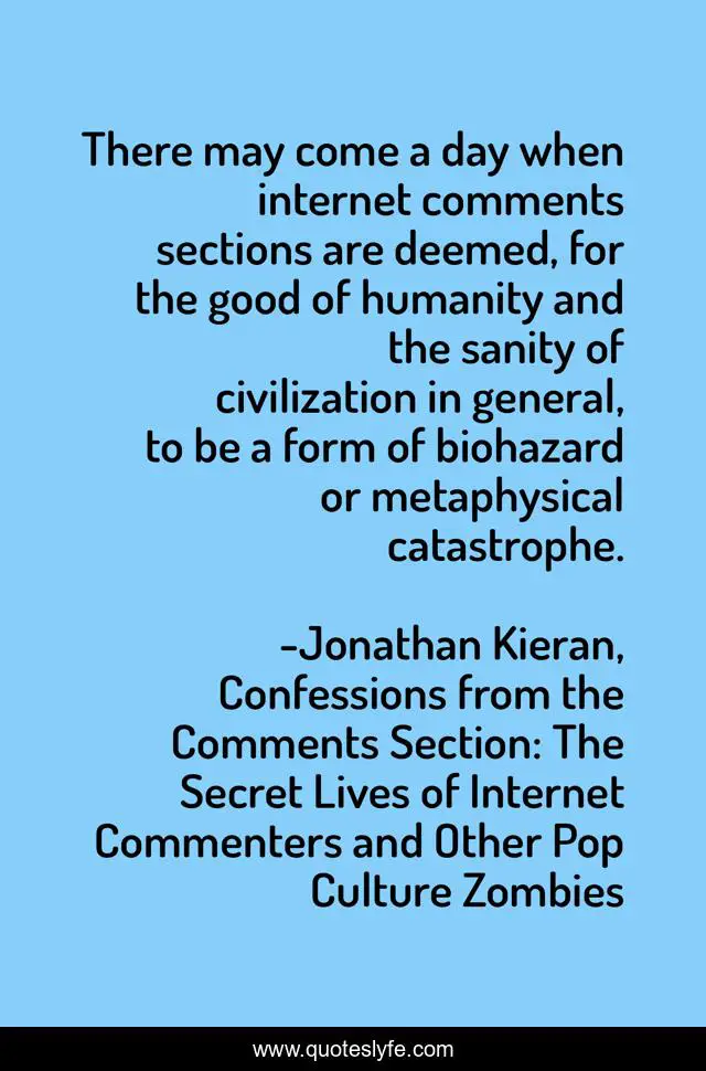 This page presents the quote "There may come a day when internet comments sections are deemed, for the good of humanity and the sanity of civilization in general, to be a form of biohazard or metaphysical catastrophe.". Author of this quote is Jonathan Kieran, Confessions from the Comments Section: The Secret Lives of Internet Commenters and Other Pop Culture Zombies. This quote is about humor, satire,.