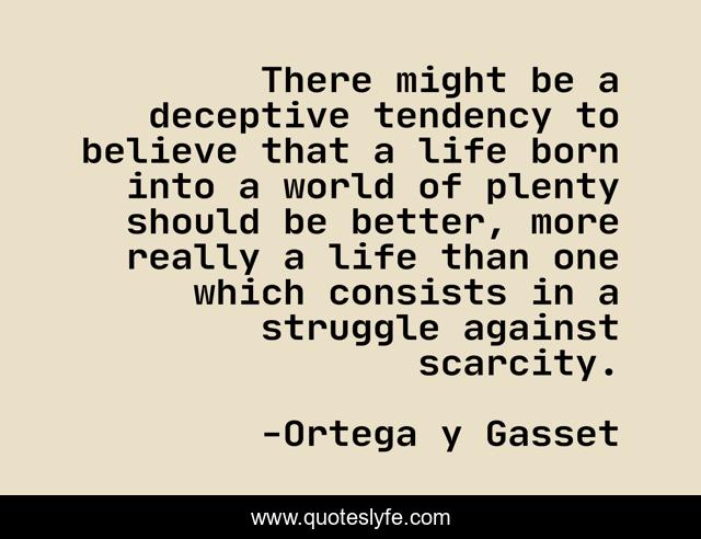 This page presents the quote "There might be a deceptive tendency to believe that a life born into a world of plenty should be better, more really a life than one which consists in a struggle against scarcity.". Author of this quote is Ortega y Gasset. .