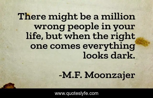 This page presents the quote "There might be a million wrong people in your life, but when the right one comes everything looks dark.". Author of this quote is M.F. Moonzajer. This quote is about dark, wrong, right-person,.