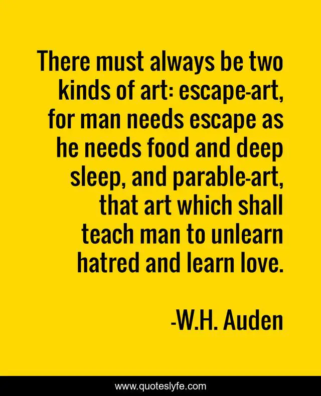 This page presents the quote "There must always be two kinds of art: escape-art, for man needs escape as he needs food and deep sleep, and parable-art, that art which shall teach man to unlearn hatred and learn love.". Author of this quote is W.H. Auden. This quote is about art, dichotomy,.