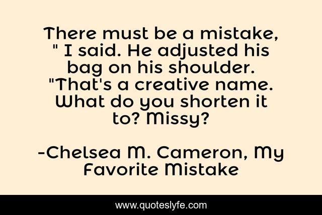 This page presents the quote "There must be a mistake, " I said. He adjusted his bag on his shoulder. "That's a creative name. What do you shorten it to? Missy?". Author of this quote is Chelsea M. Cameron, My Favorite Mistake. This quote is about hunter-zaccadelli, humor,.