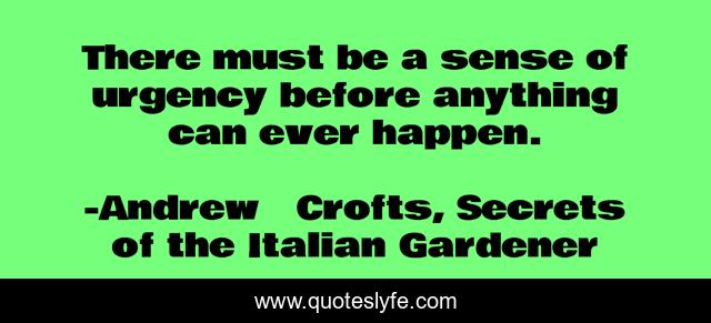 This page presents the quote "There must be a sense of urgency before anything can ever happen.". Author of this quote is Andrew Crofts, Secrets of the Italian Gardener. This quote is about achievement, change, success, wealth,.