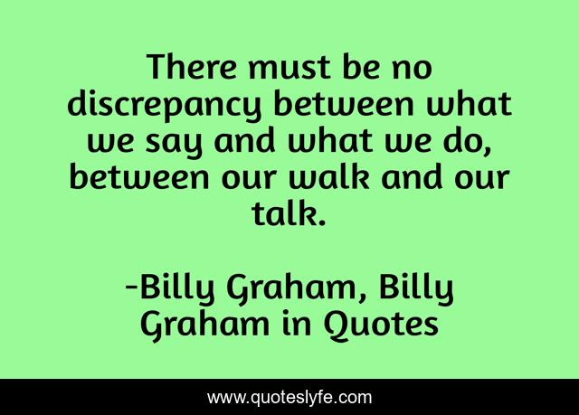 This page presents the quote "There must be no discrepancy between what we say and what we do, between our walk and our talk.". Author of this quote is Billy Graham, Billy Graham in Quotes. This quote is about christian-life, billy-graham,.