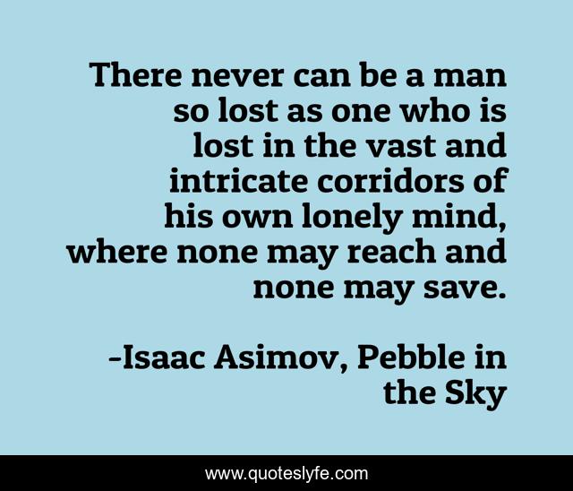 This page presents the quote "There never can be a man so lost as one who is lost in the vast and intricate corridors of his own lonely mind, where none may reach and none may save.". Author of this quote is Isaac Asimov, Pebble in the Sky. This quote is about loneliness, mind, suffering,.