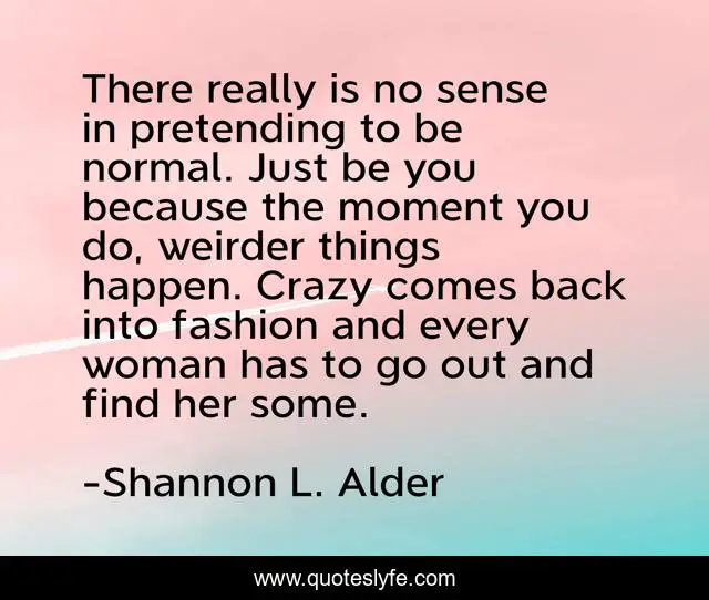 This page presents the quote "There really is no sense in pretending to be normal. Just be you because the moment you do, weirder things happen. Crazy comes back into fashion and every woman has to go out and find her some.". Author of this quote is Shannon L. Alder. This quote is about insane, funny, crazy, flattery, humor, prodigy, strange, weirdness, emulation,.