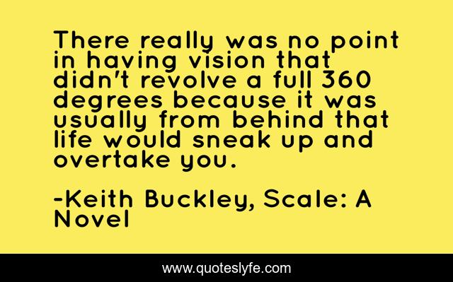 This page presents the quote "There really was no point in having vision that didn't revolve a full 360 degrees because it was usually from behind that life would sneak up and overtake you.". Author of this quote is Keith Buckley, Scale: A Novel. This quote is about life, sneak-up, vision,.