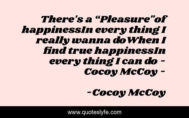 This page presents the quote "There's a “Pleasure"of happinessIn every thing I really wanna doWhen I find true happinessIn every thing I can do - Cocoy McCoy -". Author of this quote is Cocoy McCoy. This quote is about pleasure, cocoy-mccoy, wisdom, inspirational, doing-great-things, enthusiasm, philosophy-of-life, happiness,.