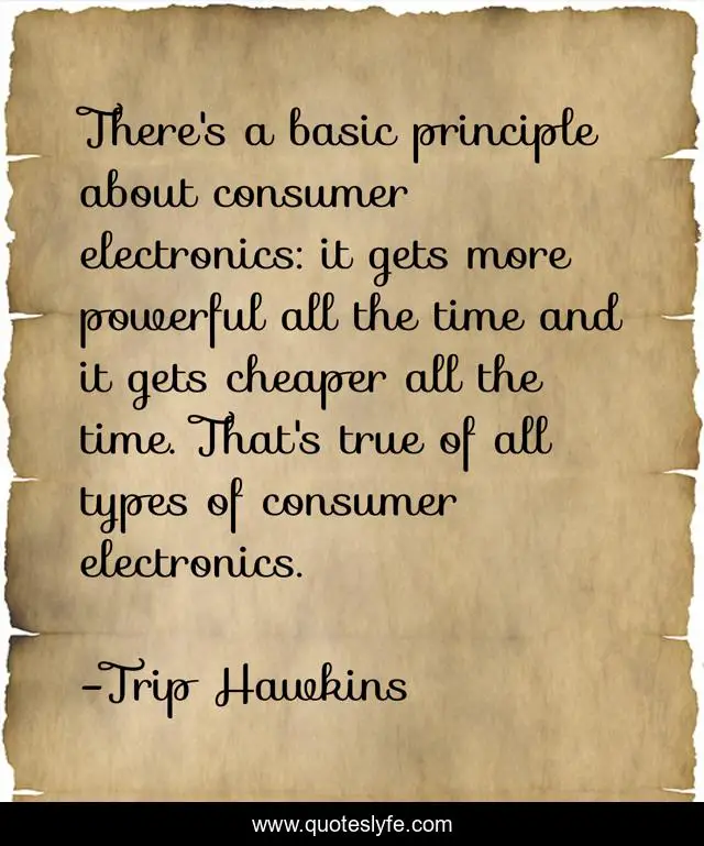 This page presents the quote "There's a basic principle about consumer electronics: it gets more powerful all the time and it gets cheaper all the time. That's true of all types of consumer electronics.". Author of this quote is Trip Hawkins. This quote is about electronics, computer, technology, comsumer, computers-and-business,.