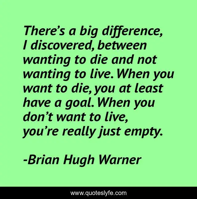 This page presents the quote "There’s a big difference, I discovered, between wanting to die and not wanting to live. When you want to die, you at least have a goal. When you don’t want to live, you’re really just empty.". Author of this quote is Brian Hugh Warner. This quote is about depression, horror, death, life, empty,.
