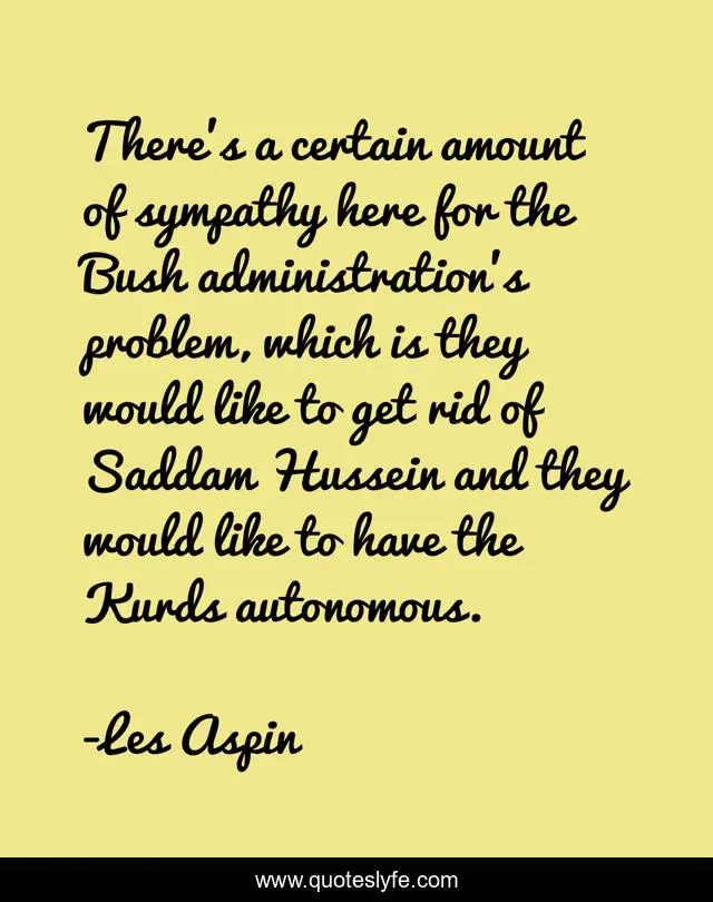 This page presents the quote "There's a certain amount of sympathy here for the Bush administration's problem, which is they would like to get rid of Saddam Hussein and they would like to have the Kurds autonomous.". Author of this quote is Les Aspin. This quote is about problem, rid, here,.