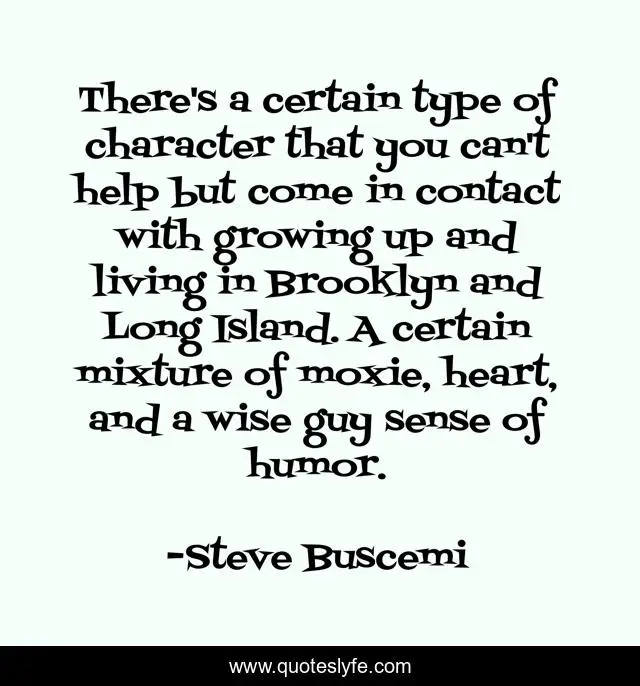 This page presents the quote "There's a certain type of character that you can't help but come in contact with growing up and living in Brooklyn and Long Island. A certain mixture of moxie, heart, and a wise guy sense of humor.". Author of this quote is Steve Buscemi. This quote is about character, wise, heart,.
