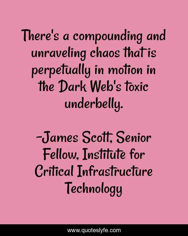 This page presents the quote "There's a compounding and unraveling chaos that is perpetually in motion in the Dark Web's toxic underbelly.". Author of this quote is James Scott, Senior Fellow, Institute for Critical Infrastructure Technology. This quote is about cybersecurity, dark-web, security, icit, james-scott,.