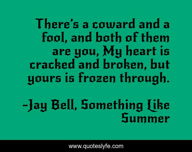This page presents the quote "There’s a coward and a fool, and both of them are you, My heart is cracked and broken, but yours is frozen through.". Author of this quote is Jay Bell, Something Like Summer. .