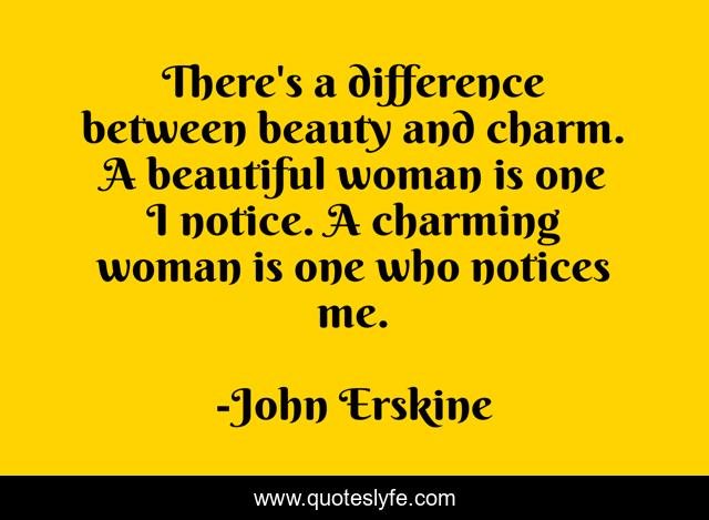 This page presents the quote "There's a difference between beauty and charm. A beautiful woman is one I notice. A charming woman is one who notices me.". Author of this quote is John Erskine. This quote is about beautiful, beautiful woman,.
