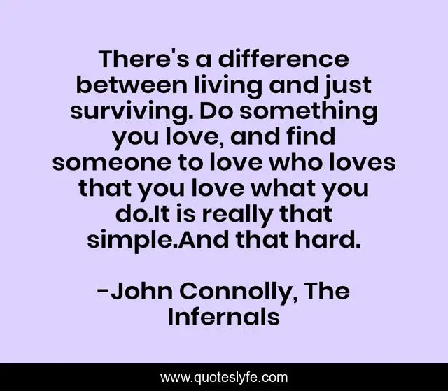 This page presents the quote "There's a difference between living and just surviving. Do something you love, and find someone to love who loves that you love what you do.It is really that simple.And that hard.". Author of this quote is John Connolly, The Infernals. This quote is about living, life, love, surviving, simple, hard, existing, passion, purpose,.