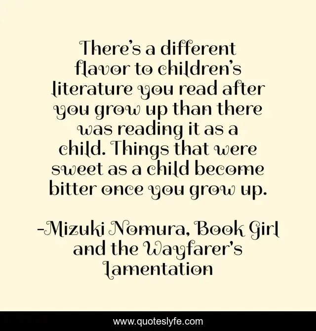 This page presents the quote "There’s a different flavor to children’s literature you read after you grow up than there was reading it as a child. Things that were sweet as a child become bitter once you grow up.". Author of this quote is Mizuki Nomura, Book Girl and the Wayfarer's Lamentation. This quote is about literature, fairytails, books, growing-up, children-s-book, child, childhood,.