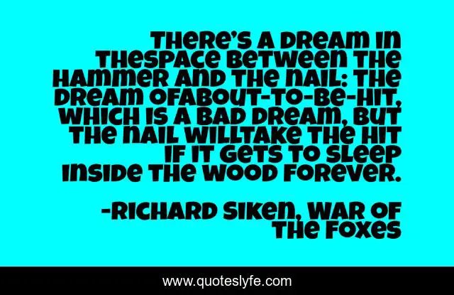 This page presents the quote "There’s a dream in thespace between the hammer and the nail: the dream ofabout-to-be-hit, which is a bad dream, but the nail willtake the hit if it gets to sleep inside the wood forever.". Author of this quote is Richard Siken, War of the Foxes. .