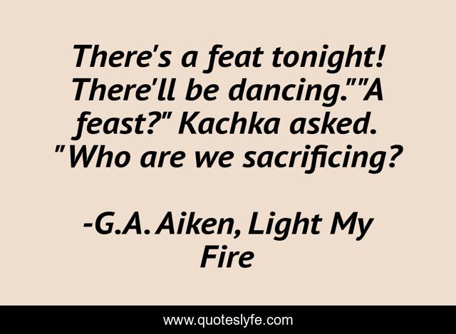 This page presents the quote "There's a feat tonight! There'll be dancing.""A feast?" Kachka asked. "Who are we sacrificing?". Author of this quote is G.A. Aiken, Light My Fire. .