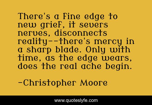 This page presents the quote "There's a fine edge to new grief, it severs nerves, disconnects reality--there's mercy in a sharp blade. Only with time, as the edge wears, does the real ache begin.". Author of this quote is Christopher Moore. .