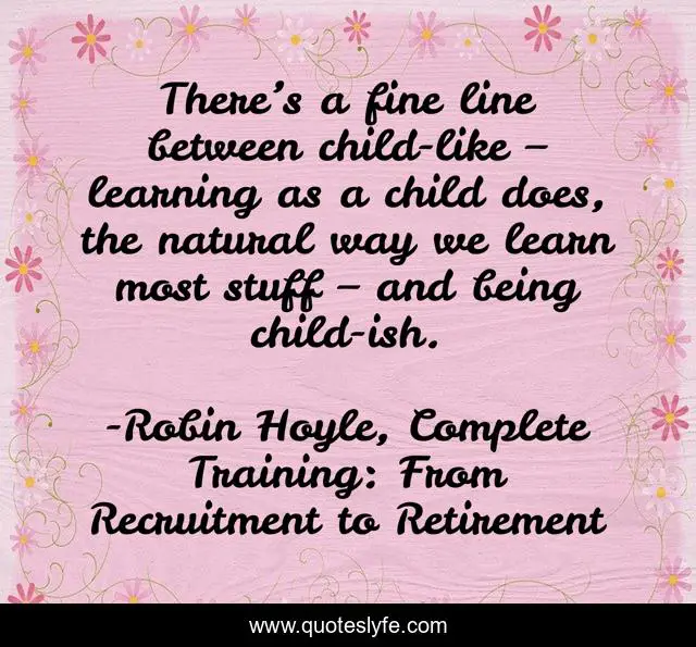 This page presents the quote "There’s a fine line between child-like – learning as a child does, the natural way we learn most stuff – and being child-ish.". Author of this quote is Robin Hoyle, Complete Training: From Recruitment to Retirement. This quote is about skills, training, child-like, learning,.