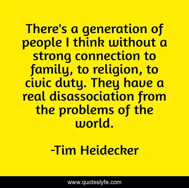 This page presents the quote "There's a generation of people I think without a strong connection to family, to religion, to civic duty. They have a real disassociation from the problems of the world.". Author of this quote is Tim Heidecker. This quote is about world, strong, family,.