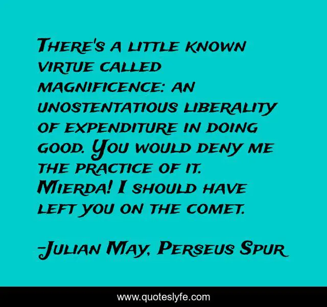 This page presents the quote "There's a little known virtue called magnificence: an unostentatious liberality of expenditure in doing good. You would deny me the practice of it. Mierda! I should have left you on the comet.". Author of this quote is Julian May, Perseus Spur. This quote is about magnificence, kindness, good-deeds, doing-good,.