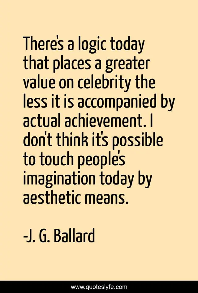 This page presents the quote "There's a logic today that places a greater value on celebrity the less it is accompanied by actual achievement. I don't think it's possible to touch people's imagination today by aesthetic means.". Author of this quote is J. G. Ballard. This quote is about today, achievement, value,.