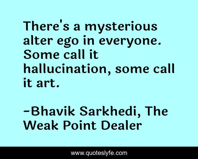 This page presents the quote "There's a mysterious alter ego in everyone. Some call it hallucination, some call it art.". Author of this quote is Bhavik Sarkhedi, The Weak Point Dealer. This quote is about artisitic, life, art,.