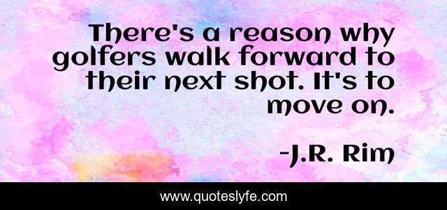 This page presents the quote "There's a reason why golfers walk forward to their next shot. It's to move on.". Author of this quote is J.R. Rim. This quote is about direction, moving-forward, walk, reason, purpose, next-chapter, golf, next-chance, moving-on,.