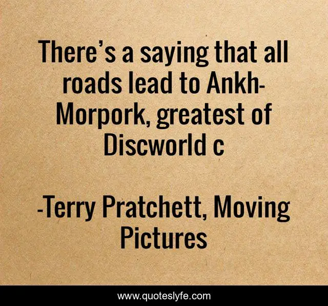 This page presents the quote "There’s a saying that all roads lead to Ankh-Morpork, greatest of Discworld c". Author of this quote is Terry Pratchett, Moving Pictures. This quote is about city, urban-living, humor,.