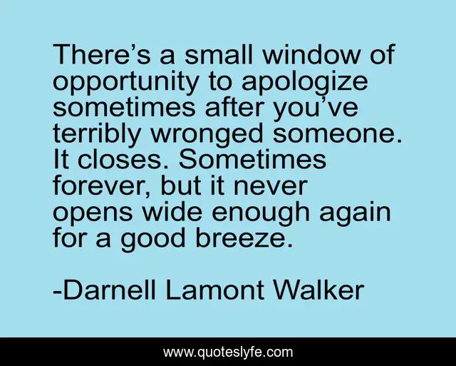 This page presents the quote "There’s a small window of opportunity to apologize sometimes after you’ve terribly wronged someone. It closes. Sometimes forever, but it never opens wide enough again for a good breeze.". Author of this quote is Darnell Lamont Walker. This quote is about friendship, window, i-m-sorry, sorry, forgiveness, opportunity,.