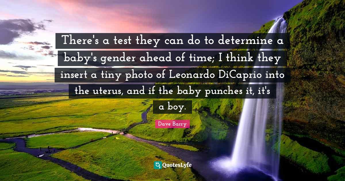 This page presents the quote "There's a test they can do to determine a baby's gender ahead of time; I think they insert a tiny photo of Leonardo DiCaprio into the uterus, and if the baby punches it, it's a boy.". Author of this quote is Dave Barry. This quote is about baby, boys, tiny, gender, uterus, thinking, determine, leonardo, can do,.