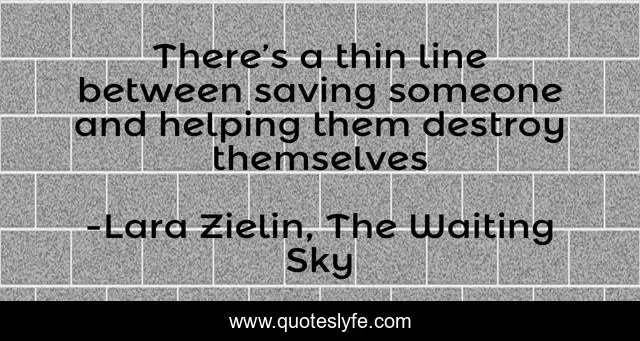 This page presents the quote "There’s a thin line between saving someone and helping them destroy themselves". Author of this quote is Lara Zielin, The Waiting Sky. This quote is about thin-line, saving, help,.