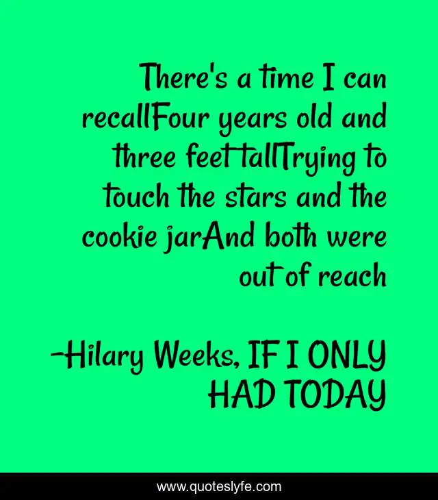 This page presents the quote "There's a time I can recallFour years old and three feet tallTrying to touch the stars and the cookie jarAnd both were out of reach". Author of this quote is Hilary Weeks, IF I ONLY HAD TODAY. This quote is about lyrics, reaching,.