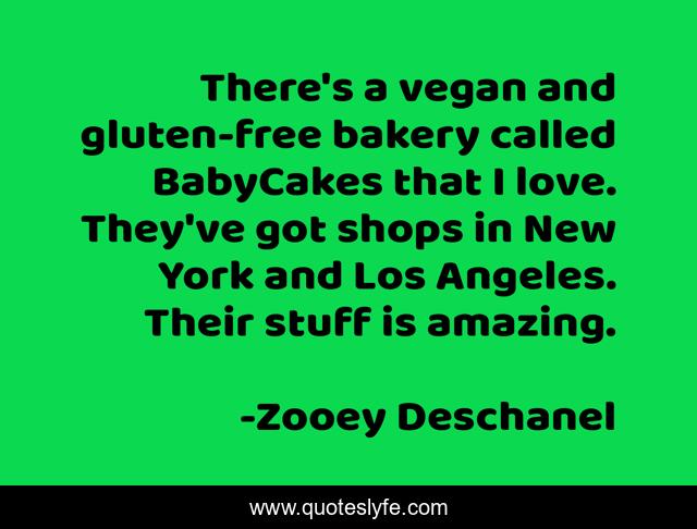 This page presents the quote "There's a vegan and gluten-free bakery called BabyCakes that I love. They've got shops in New York and Los Angeles. Their stuff is amazing.". Author of this quote is Zooey Deschanel. This quote is about new, new york, love, affection,.