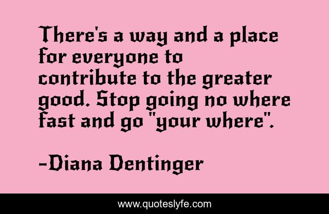 This page presents the quote "There's a way and a place for everyone to contribute to the greater good. Stop going no where fast and go "your where".". Author of this quote is Diana Dentinger. This quote is about spiritual-growth, confidence, meaning-of-life, personal-growth, positive, motivational, life-purpose, optimistic, inspirational,.