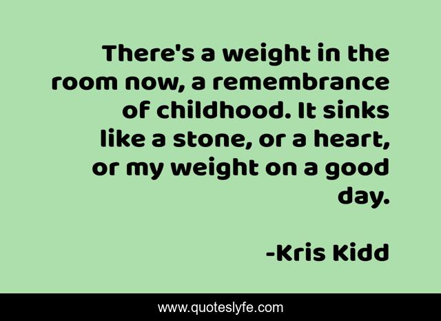This page presents the quote "There's a weight in the room now, a remembrance of childhood. It sinks like a stone, or a heart, or my weight on a good day.". Author of this quote is Kris Kidd. This quote is about trauma, childhood, depression, eating-disorders,.
