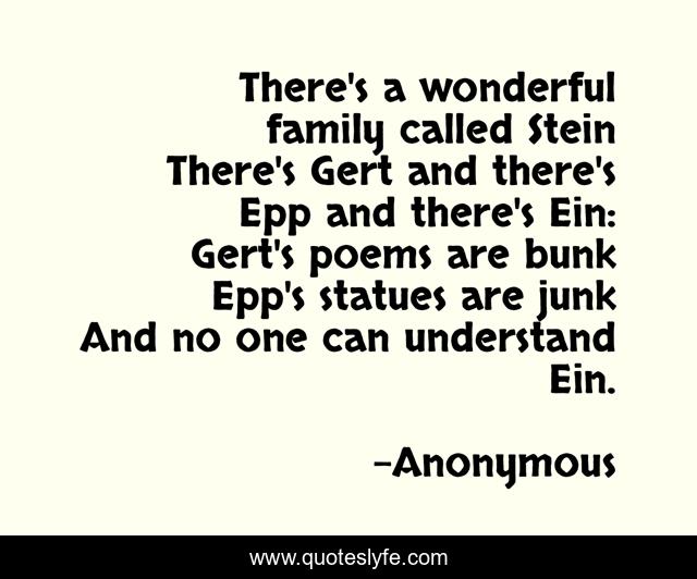 This page presents the quote "There's a wonderful family called Stein There's Gert and there's Epp and there's Ein: Gert's poems are bunk Epp's statues are junk And no one can understand Ein.". Author of this quote is Anonymous. This quote is about quips, comments,.