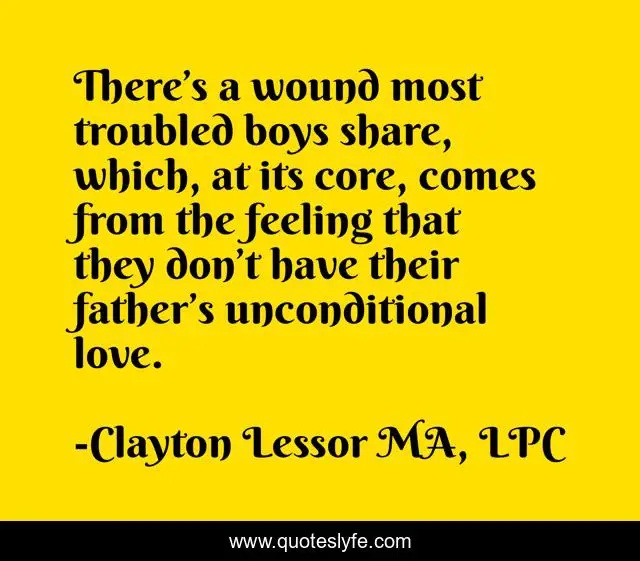 This page presents the quote "There’s a wound most troubled boys share, which, at its core, comes from the feeling that they don’t have their father’s unconditional love.". Author of this quote is Clayton Lessor MA, LPC. This quote is about discipline, boy, childhood, parenthood, parent, family, motherhood, mentor, mother,.
