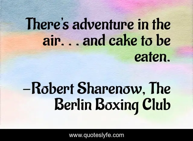 This page presents the quote "There's adventure in the air. . . and cake to be eaten.". Author of this quote is Robert Sharenow, The Berlin Boxing Club. This quote is about life, adventure,.