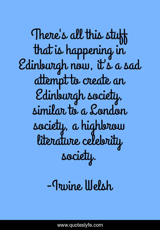 This page presents the quote "There's all this stuff that is happening in Edinburgh now, it's a sad attempt to create an Edinburgh society, similar to a London society, a highbrow literature celebrity society.". Author of this quote is Irvine Welsh. This quote is about society, literature, london,.
