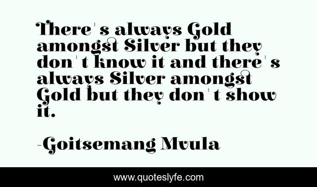This page presents the quote "There's always Gold amongst Silver but they don't know it and there's always Silver amongst Gold but they don't show it.". Author of this quote is Goitsemang Mvula. This quote is about perception, mind, the-eye,.