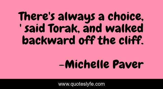 This page presents the quote "There's always a choice, ' said Torak, and walked backward off the cliff.". Author of this quote is Michelle Paver. This quote is about enthusiasm, inspirational,.