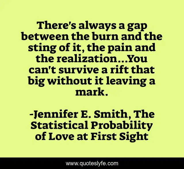 This page presents the quote "There's always a gap between the burn and the sting of it, the pain and the realization...You can't survive a rift that big without it leaving a mark.". Author of this quote is Jennifer E. Smith, The Statistical Probability of Love at First Sight. .