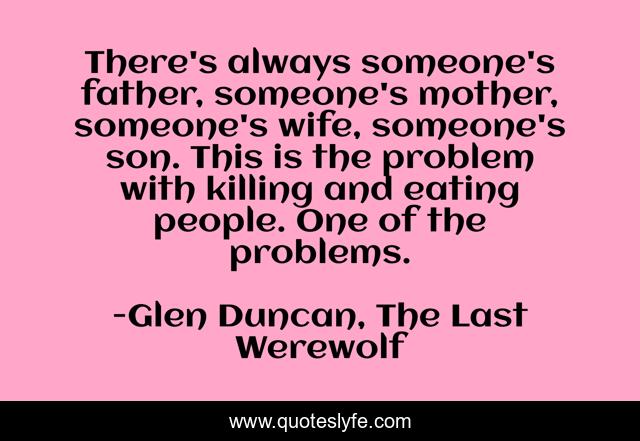 This page presents the quote "There's always someone's father, someone's mother, someone's wife, someone's son. This is the problem with killing and eating people. One of the problems.". Author of this quote is Glen Duncan, The Last Werewolf. This quote is about murder, philosophy,.