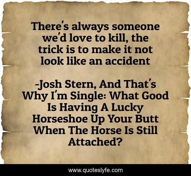 This page presents the quote "There's always someone we'd love to kill, the trick is to make it not look like an accident". Author of this quote is Josh Stern, And That's Why I'm Single: What Good Is Having A Lucky Horseshoe Up Your Butt When The Horse Is Still Attached?. This quote is about funny, accident, humor, trick, kill, absurd, comedy,.