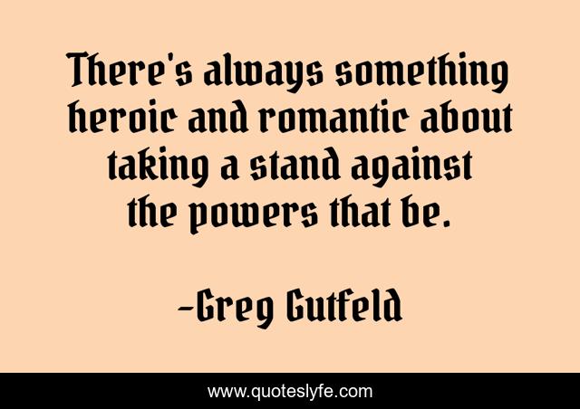 This page presents the quote "There's always something heroic and romantic about taking a stand against the powers that be.". Author of this quote is Greg Gutfeld. This quote is about always, stand, something,.