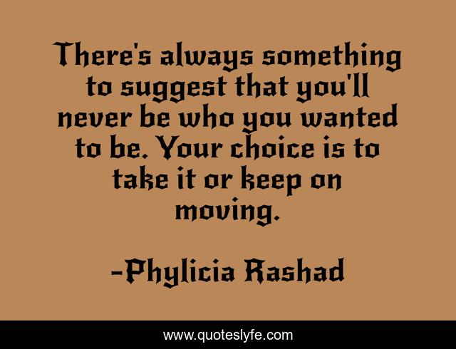 This page presents the quote "There's always something to suggest that you'll never be who you wanted to be. Your choice is to take it or keep on moving.". Author of this quote is Phylicia Rashad. This quote is about moving, choice,.
