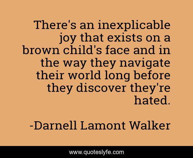 This page presents the quote "There's an inexplicable joy that exists on a brown child's face and in the way they navigate their world long before they discover they're hated.". Author of this quote is Darnell Lamont Walker. This quote is about kids, joy, children, racism, playing, child, people-of-color, hatred, america,.